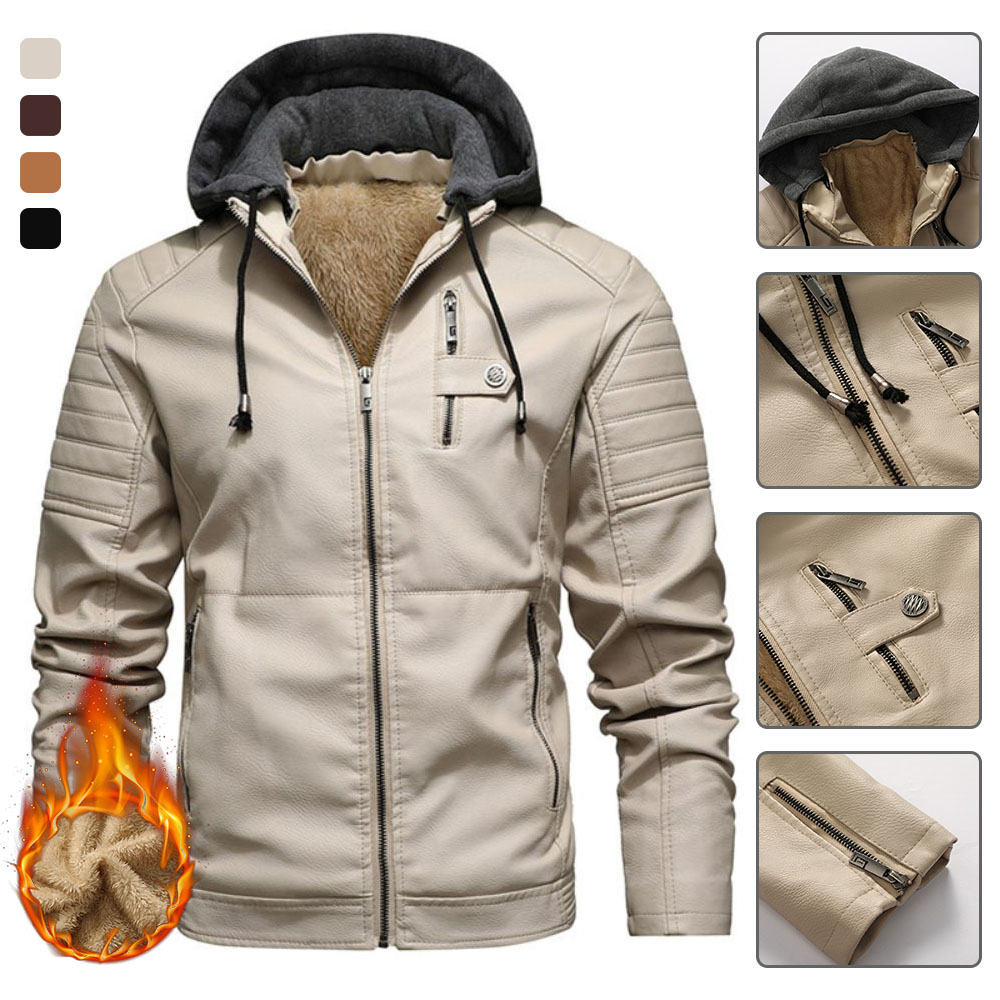 1* Neue Fleece-Lederjacke mit warmer Kapuze für Herren